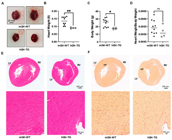 Hearts from 4-week-old male hGH-TG mice were visibly smaller and weighed less than those from age-matched mGH-WT mice (Figure 1A,B), which appears consistent with the smaller mouse size based on length (~20% shorter from head to tail [16]) and body weight (Figure 1C). There was no significant difference between mean heart weight/body weight ratios determined for hGH-TG and mGH-WT mice (Figure 1D). Hearts were also fixed, sectioned transversely, and stained with H&E to compare general ventricular morphology, which appeared proportionate in both mouse types (Figure 1E). Staining with picro-sirius red also suggested similar levels of interstitial collagen deposition, and there was no evidence of significant fibrosis (or fibrous collagen) in both mouse types (Figure 1F).