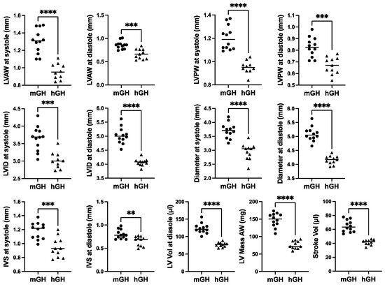Cardiac structure in 28-week-old male mGH-WT (filled circles, n = 12) and hGH-TG (filled triangles, n = 11) CD-1 mice maintained on an RCD were assessed using echocardiography, and the results were compared. Assessments included left ventricular (LV) anterior and posterior wall (LVAW and LVPW) thickness at systole and diastole, LV internal diameter (LVID) and diameter at systole and diastole, interventricular septum (IVS) thickness at systole and diastole, LV volume (Vol) at diastole, LV Mass and Stroke Vol. Mean values determined for each mouse type (horizontal line) as well as values assessed for each mouse are shown. Significance was assessed using the Mann–Whitney test and considered significant if p < 0.05 (** p < 0.01, *** p < 0.001 or **** p < 0.0001).