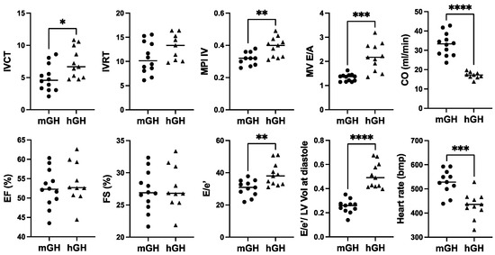 Comparison of cardiac function in 28-week-old male mGH-WT (filled circles, n = 12) and hGH-TG (filled triangles, n = 11) CD-1 mice fed a regular chow diet by echocardiography. Assessments included isovolumic contraction time (IVCT), isovolumic relaxation time (IVRT), left ventricular (LV) isovolumic myocardial performance index (LV MPI), rate at which the atrial and ventricular pressures equilibrate after onset of the E wave (MV E/A), cardiac output (CO), LV ejection fraction (EF), fractional shortening (FS), mitral inflow E wave to early diastolic mitral annular tissue velocity (E/e′), ratio of E/e′ divided by left ventricular end-diastolic volume (LV Vol-d), and heart rate. Mean value determined for each mouse type (horizontal line) as well as values assessed for each mouse are shown. Significance was assessed using the Mann–Whitney test and considered significant if p < 0.05 (* p < 0.05, ** p < 0.01, *** p < 0.001, or **** p < 0.0001).