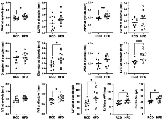 In terms of effects of chronic HFD for 24 weeks, modest ~10% increases in the diameter and internal diameter as well as LV anterior, posterior, and IVS thicknesses were suggested at diastole (Figure 5). However, only the effect on diameter, internal diameter, and IVS thickness at diastole reached significance (p < 0.05). Mild but significant 1.2-fold increases in LV mass and stroke volume were also observed, as well as a 1.1-fold increase in LV anterior and posterior wall thickness at systole (Figure 5).