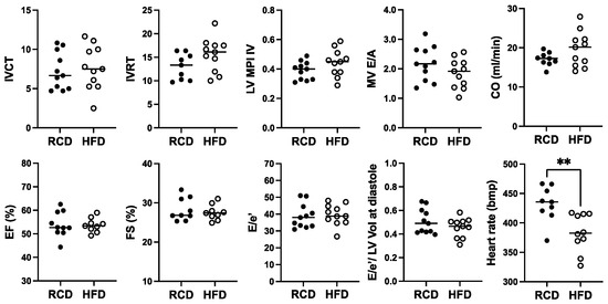 The effect of a high-fat diet (HFD; open circles, n = 11) versus regular chow diet (RCD; filled circles, n = 11) on cardiac function in 28-week-old male hGH-TG CD-1 mice by echocardiography. Assessments included isovolumic contraction time (IVCT), isovolumic relaxation time (IVRT), left ventricular (LV) isovolumic myocardial performance index (LV MPI), rate at which the atrial and ventricular pressures equilibrate after onset of the E wave (MV E/A), cardiac output (CO), LV ejection fraction (EF), fractional shortening (FS), mitral inflow E wave to early diastolic mitral annular tissue velocity (E/e′), ratio of E/E′ divided by left ventricular end-diastolic volume (LV Vol), and heart rate. Mean value determined for each diet (horizontal line) as well as values assessed for each mouse are shown. Significance was assessed using the Mann–Whitney test and considered significant if p < 0.05 (** p < 0.01).