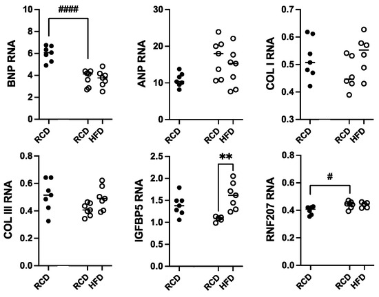 Assessment of heart RNA levels in male hGH-TG CD-1 mice (open circles, n = 7) fed high-fat diet (HFD) for 24 weeks versus mice maintained on a regular chow diet (RCD, n = 7). RNA from age-matched mGH-WT CD-1 mice (filled circles, n = 7) fed RCD were included for comparison. Total RNA was assessed relative to hypoxanthine guanine phosphoribosyltransferase transcripts with specific primers by qPCR for atrial natriuretic peptide (ANP), B-type natriuretic peptide (BNP), collagen type I (COL I) and collagen type III (COL III), insulin-like growth factor binding protein 5 (IGFBP5), and ring finger protein 207 (RNF207). Results were assessed by two-way ANOVA with Tukey’s post hoc test. For each test group, values for each mouse are shown as well as the group mean (horizontal line). Significant differences related to mouse type (# p < 0.05, #### p < 0.0001) and diet (** p < 0.01) are indicated.