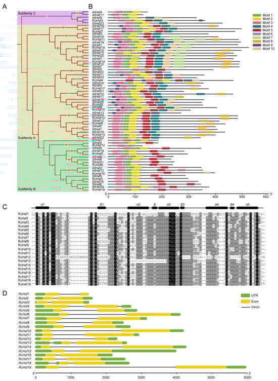 Phylogenetic and structural analysis of RcHsfs. (A) The phylogenetic trees of 19 RcHsfs, 24 Arabidopsis Hsfs, and 24 tomato (S. lycopersicum) Hsfs constructed by the neighbor-joining model in MEGA 5.1. RcHsfs were grouped into three subfamilies: subfamily A (yellow), subfamily B (green), and subfamily C (purple). (B) The conserved motif analysis of Hsfs in the rose, Arabidopsis, and the tomato (S. lycopersicum). Ten motifs are represented by different colors, and their specific sequence information is shown in Figure S1. (C) The base sequences and frequencies in the conserved domain of RcHsf proteins. (D) Exon and intron structures of 19 RcHsfs.