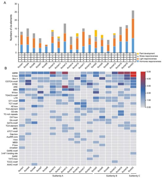 Analysis of the cis-acting elements in the promoter sequences of RcHsf genes. (A) The numbers of cis-acting elements in each RcHsf gene promoter. The four colors represent four categories: plant development (yellow), stress responsiveness (gray), light responsiveness (orange), and hormone responsiveness (blue). The number of every category was represented by a histogram and listed in the table. (B) The heatmap of the number of cis-acting elements in the promoter sequences of the RcHsf genes. The color scale from gray to red indicates the number of cis-acting elements from 1 to 5. From left to right are subfamily A, subfamily B, and subfamily C.