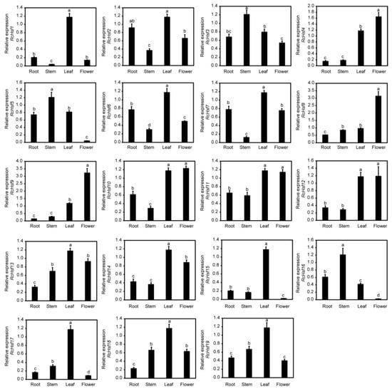 The expression of RcHsf genes in rose roots, stems, leaves, and flowers. The letters above the bar charts indicate the significant differences between different samples (p < 0.05).