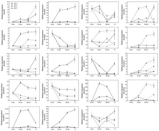 The expression of RcHsf genes at high temperatures. The expression of RcHsf genes at 30 °C, 35 °C, 37 °C, and 42 °C for 15 min, 30 min, and 1 h; 25 °C is the control temperature.