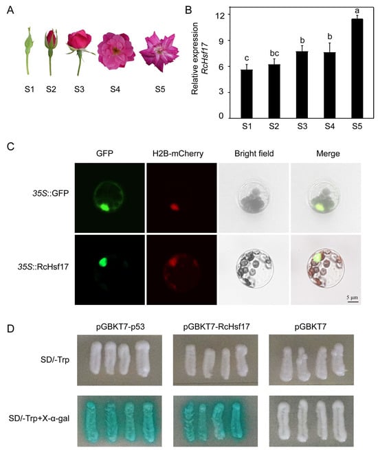 Expression profile analysis and subcellular localization and transcriptional activity assay of RcHsf17. (A) Phenotypes of the five stages of the flower development process in R. chinensis; S1: small bud stage, bud closed; S2: big bud stage, petals slightly exposed; S3: initial opening stage, petals extended; S4: full bloom stage, petals fully open; S5: late blooming stage, petals become curly, and the color becomes lighter. (B) Expression of RcHsf17 in the five stages of the flower development process. (C) Subcellular localization of the RcHsf17 protein. GFP: 35S::RcHsf17 fusion protein; H2B-mCherry: H2B-mCherry fusion protein (positive marker); Merged: merged image of 35S::RcHsf17, H2B-mCherry, and bright-field. Scale bar: 5 µm. (D) Yeast one-hybrid assay. X-α-gal: 5-Bromo-4-chloro-3-indoxyl-α-D-galactopyranoside (the chromogenic substrate of yeast galactosidase); pGBKT7-p53: positive control; pGBKT7: negative control. At least four yeast cells were tested for each construct. The letters above the bar chart indicate the significant difference between the different samples (p < 0.05).
