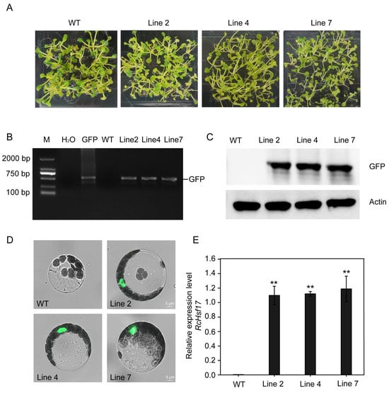 To investigate the function of RcHsf17, we heterologously transformed RcHsf17 into Arabidopsis. Three RcHsf17 overexpression transgenic homozygous lines (Line 2, Line 4, and Line 7) were obtained with 50 mg/L of hygromycin (Figure 7A) and were further identified by PCR and Western blotting (Figure 7B,C). Moreover, we extracted protoplasts of the RcHsf17 transgenic lines and observed the expression of GFP protein fluorescence. Consistent with the subcellular localization of the RcHsf17 protein, GFP protein fluorescence was observed in the nucleus (Figure 7D). The expression of RcHsf17 in the transgenic lines was significantly higher than in the wild type (Figure 7E). These results indicate that we have obtained three transgenic homozygous lines with a high expression of RcHsf17.