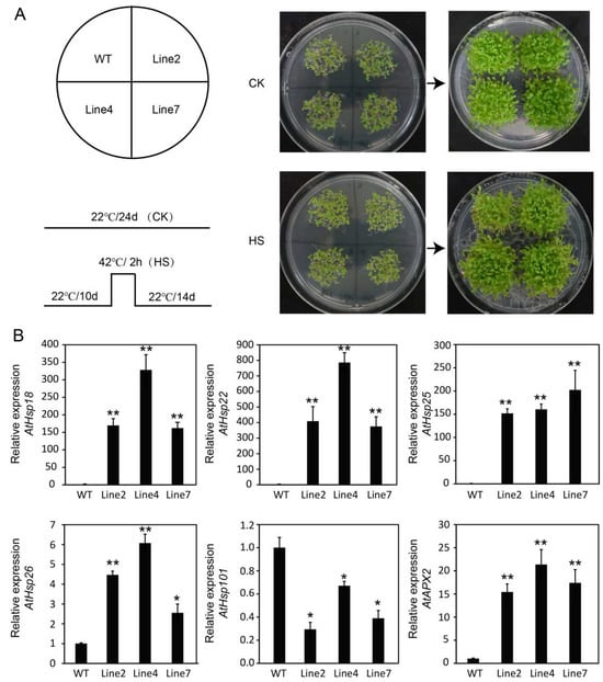 For the high-temperature treatment, the vernalized seeds of the wild-type and homozygous transgenic lines were sterilized using 75% alcohol for 1 min and then rinsed with sterile water four times. The vernalized seeds of the wild-type and homozygous transgenic lines were planted on MS agar plates, which are more conducive to the statistical germination rate and root hair phenotype. Plates of wild-type and transgenic lines were placed in dark conditions at 4 °C for 2 d and then transferred to a 23 °C artificial climate box for 14 d, the parameters of which were set to a photoperiod of 16/8 h light/darkness, 4800 LX light, and 60% relative humidity. Then, the seedlings of the wild-type and transgenic lines were placed at 42 °C for 2 h, and the survival rates were calculated after a 14-day recovery at 22 °C. Moreover, the wild-type and transgenic seedlings were transferred to soil for 15 days, the phenotype was observed, and samples were collected, and a transient temperature treatment experiment at 42 °C for 15 min, 30 min, and 1 h was carried out. At the same time, samples were collected for RT-PCR [].