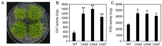 In order to verify the role of RcHsf17 in the high-temperature response, 10-day-old seedlings of wild-type and RcHsf17 overexpression lines were transferred to an artificial climate chamber adjusted to 42 °C for 2 h (HS), and then the temperature was adjusted to 22 °C to continue growing (Figure 8A). The gene expression related to the high-temperature response in the wild-type and transgenic lines were detected by RT-PCR, including AtHsp18, AtHsp22, AtHsp25, AtHsp26, AtHsp101, and AtAPX2. As shown in Figure 8B, the expression of AtHsp18, AtHsp22, AtHsp25, AtHsp26, and AtAPX2 in the RcHsf17 overexpression lines was significantly higher than that in the wild type, while there was no significant difference in the expression of AtHsp101 between the RcHsf17 overexpression lines and the wild type. Moreover, we detected the expression of AtHsp genes in wild-type and transgenic seedlings grown on soil for 15 days by RT-PCR at 42 °C. We found the expression of AtHsp18, AtHsp22, AtHsp25, AtHsp26, AtHsp101, and AtAPX2 in RcHsf17 overexpression lines was significantly higher than that in the wild type at 42 °C (Figure S4). Furthermore, the activities of CAT and POD were enhanced in the RcHsf17 overexpression transgenic lines under 42 °C conditions (Figure 9). These results show that RcHsf17 overexpression improves thermotolerance in transgenic Arabidopsis by regulating the expression changes of AtHsps and increasing the activities of antioxidant enzymes.
