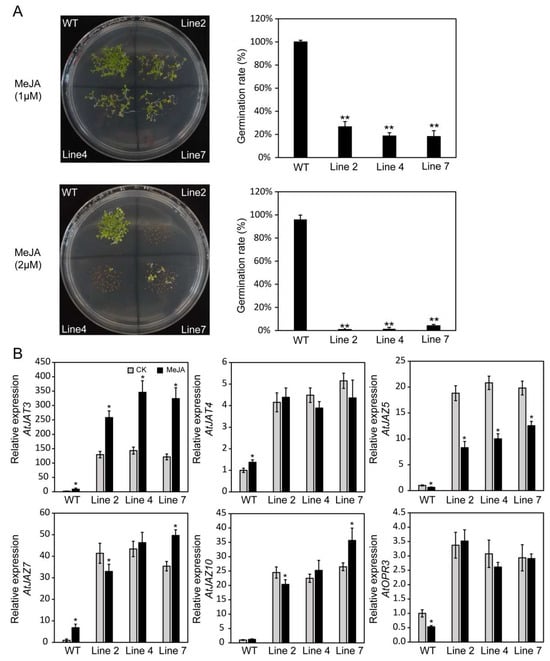 For the MeJA treatment, the sterilized seeds of the wild-type and transgenic lines were planted on MS agar plates containing 1 μm of MeJA and 2 μm of MeJA. After 14 days, the phenotype was observed, and the germination rate was determined. At the same time, samples were collected for real-time quantitative PCR detection.