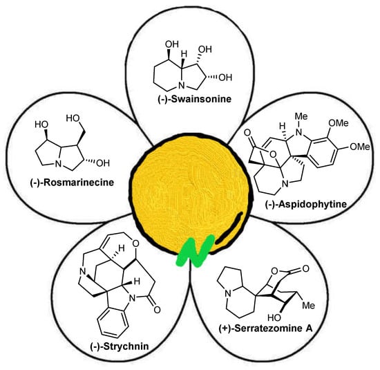 The imine moiety can be reduced or oxidized and functionalized, which makes it a very valuable building block for alkaloid synthesis. Examples of valuable alkaloids synthesized from imines are shown in Figure 1. This figure shows the diversity of the structures of the resulting alkaloids based on cyclic imines. They include pyrrolizidine and indolizidine alkaloids with simple structures, as well as complex polycyclic alkaloids belonging to the classes Aspidosperma, Stephacidin, etc.