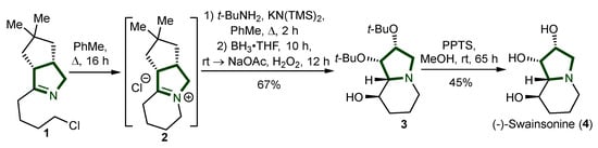 One of the methods used for the synthesis of Swainsonine (4) is the cyclization of imine 1 in boiling toluene, followed by treatment with tert-butylamine, potassium bis(trimethylsilyl)amide and borane–tetrahydrofuran, which leads to heterocycle 3 at 67% yield (Scheme 1). At the last stage, heterocycle 3 is treated with pyridinium p-toluenesulfonate (PPTS), which makes it possible to enantioselectively obtain (-)-Swainsonine (4) (>95% ee) [].