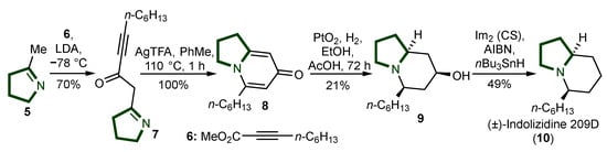 In 2018, P. Unsworth and colleagues [] reported efficient Ag(I)-catalyzed cyclization of ketamine 7 derived from 2-methyl-1-pyrroline 5. It should be noted that the authors who created this method isolated the desired bicyclic product 8 in quantitative yield with further hydrogenation with hydrogen using platinum (IV) oxide as a catalyst. During the final stage, Barton–McCombie deoxygenation was carried out with the formation of (±)-Indolizidine 209D (10) (Scheme 2). Unfortunately, the absence of enantioselectivity renders this method less applicable to the synthesis of biologically relevant compounds. This alkaloid was first isolated from the skin of tropical frogs of the genus Dendrobates []. It has a number of pharmacological properties, including blocking the neuromuscular transmission [].