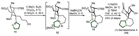 Serratezomine A (14) was isolated from the club moss Lycopodium serratum relatively recently, in 2000 []. The use of an imine 11 as a starting compound made it possible to synthesize Serratezomine A quite efficiently (Scheme 3). Thus, cyclization of the imine 11 to mesylate 12 and subsequent reduction with sodium cyanoborohydride led to heterocycle 13. Subsequent saponification and intramolecular cyclization resulted in Serratezomine A in a 33% yield [].