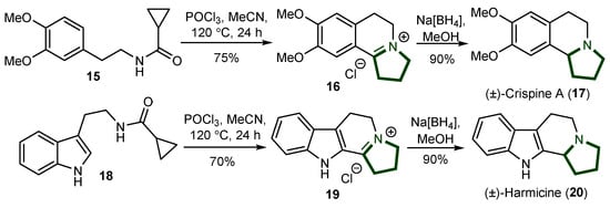 Several review articles have been devoted to the synthesis of Crispine A (17) and Harmicine (20) [,]. This interest is due to the biological activity of these alkaloids [,]. It is very interesting that these alkaloids were synthesized before they were discovered in living objects. For example, Crispine A was isolated in 2002 from extracts of Carduus crispus []. It is quite simple to synthesize these alkaloids in almost quantitative yield by cyclization of amides 15 and 18 by an excess of phosphoryl chloride to heterocycles 16 and 19, which could be easily reduced to products 17 and 20 with sodium borohydride in methanol [] (Scheme 4). The above reactions can be carried out at gram scale; however, only racemic compounds were obtained.