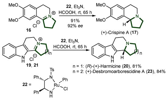In a series of works [,], a method for synthesizing (R)-(+)-Crispine A, (R)-(+)-Harmicine and (R)-(+)-Desbromarborescidine is described, based on stereoselective hydrogenation of iminium salts 16, 19, 21 in the presence of ruthenium catalyst (Scheme 5).