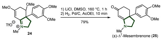 The alkaloid (±)-Δ7-Mesembrenone (25) could be isolated in one stage [] from iminium salt 24 by demethylation and hydrogenation by Krapcho with a yield of 79%; this alkaloid exhibits various biological activities [] (Scheme 6). The drawback of this method is the lack of enatioselectivity. Mesembrenone was found to be dominant alkaloid in the leaves of sprouting bulbs and in the flowers Narcissus cv. Hawera [] and Sceletium tortuosum []. Mesembrine significantly contributes to the anxiolytic effect of Zembrin [].