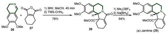 The authors of [] described a short process for synthesizing (±)-Jamtine (29). The key step was the condensation of 6,7-dimethoxy-3,4-dihydroisoquinoline 26 and tetrahydrophthalic anhydride 27 by microwave activation, which occurred in good yield and high diastereomeric selectivity. Reducing the amide function resulted in (±)-Jamtine (Scheme 7). The alkaloid Jamtinine was isolated from whole plants of Cocculus hirsutus [], which are renowned for their therapeutic properties [,,].