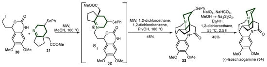 (-)-Isoschizogamine (34) was first isolated in 1963 from the plant Schizozygia caffaeoides []. It exhibited antimicrobial and antifungal activity in micromolar concentrations []. Reacting compounds 30 and 31 under microwave irradiation resulted in iminium salt 32, which was dissolved in 1,2-dichloroethane/1,2-dichlorobenzene and irradiated again (Scheme 8). Under these conditions, hexacyclic compound 33 was isolated in 45% yield as a mixture of two diastereomers (dr = 1:1). Oxidation of compound 33 to selenoxide followed by syn-elimination led to the production of (-)-Isoschizogamine [].