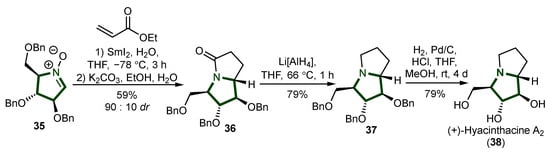 Pyrrolizidine alkaloids are predominantly synthesized from 3,4-dihydro-2H-pyrrole 1-oxide derivatives. Thus, in [], a method for the synthesis of the alkaloid (+)-Hyacinthacine A2 (38) is described; it was isolated from the bulbs of Muscari armeniacum (Hyacinthaceae) and showed promising inhibitory activity against glycosidases [,]. Thus, nitrone 35 was treated with SmI2 and ethyl acrylate was added. Treatment of the reaction mixture with potassium carbonate in ethanol/water resulted in a lactam 36. Reducing the lactam 36 using lithium aluminum hydride made it possible to obtain pyrrolizidine 37. Then, the benzyl groups were removed, which made it possible to isolate (+)-Hyacinthacine A2 (Scheme 9).