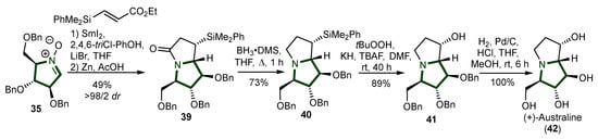 A similar strategy was used by P. Gilles and S. Py [] to synthesize (+)-Australine (42), which was first isolated from the seeds of Castanospmnum australe []. This alkaloid is interesting because it inhibits amyloglucosidase and the breakdown of glycoproteins []. A recent review article [] was devoted to the synthesis of Australine and its derivatives, which is indicative of the growing interest in this alkaloid. This alkaloid is capable of inhibiting amyloglucosidase and glycoproteins breakdown []. A recent review article []. The interaction of nitrone 35 with acrylate led to lactam 39 with a yield of 49% in the form of a single diastereomer. Then, through a series of stages, the target product 42 was isolated, and the last stage proceeded with quantitative yield (Scheme 10). We note the good yield and high enantioselectivity of the proposed reaction sequence.