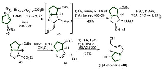 (+)-Heliotridine (48) is a 1,2-unsaturated pyrrolizidine alkaloid which presents in plants of the Heliotropium genus [,]. Total synthesis of (+)-Heliotridine (48) was achieved by F.M. Cordero and colleagues []; their method is based on a highly selective 1,3-dipolar cycloaddition of (S)-3-tert-butoxypyrroline N-oxide 43 with ethyl 4-bromocrotone. The total yield of the product 48 was 17% (Scheme 11).