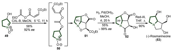 The asymmetric total synthesis of (-)-Rosmarinecine (53), first isolated in 1940 from the South African plant Senecio retrorsus [], was carried out in three stages []. The key step was the reaction of nitrone 49 with an ester catalyzed by Candida antarctica lipase B (CAL-B). This was followed by intramolecular [3+2] dipolar cycloaddition, which resulted in a heterocycle 51 with an enantiomeric excess of 92%. Hydrogenation of the N–O bond and subsequent reduction with Red-Al (Sodium bis(2-methoxyethoxy)aluminum hydride) led to (-)-Rosmarinecine (53) (Scheme 12). The high enantioselectivity of this approach should be emphasized.