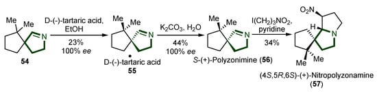 Nitropolyzonamine is one of the few alkaloids of animal origin. This unusual alkaloid, produced by the centipede Polyzonium rosalbum [,], protects the organism from enemies. The authors of [] describe a method used to synthesize (4S,5R,6S)-(+)-Nitropolyzonamine (57). The starting compound is an enantiomerically pure imine 56, which was obtained from heterocycle 54 by treatment with D-(-)-tartaric acid. Conversion of the salt to the free base allowed the enantiospecific isolation of S-(+)-Polyzonimine (56) with quantitative yield, which reacted with 3-iodo-1-nitropropane to form (4S,5R,6S)-(+)-Nitropolyzonamine (Scheme 13). The proposed approach benefits from its short synthetic scheme (3 stages), high enantioselectivity and use of readily available D-(-)-tartaric acid as both a reagent and a catalyst.