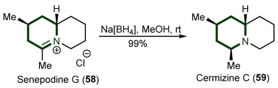 There are more than 200 known quinolizidine alkaloids, which are united by the presence of a 1-azabicyclo[4.4.0]decane core [,]. Like most alkaloids, quinolizidine alkaloids protect plants from pests and diseases, i.e., they perform a protective function. Despite this, many representatives of this class of alkaloids are utilized by humans []. Reduction of (-)-Senepodine G (58) with sodium borohydride in methanol resulted in (-)-Cermizine C (59) [] (Scheme 14). This alkaloid is found in plants of the genus Lycopodium [].