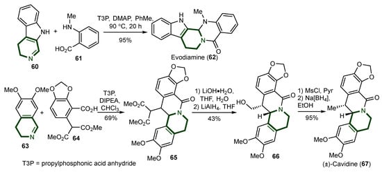 The work [] describes a method used for the synthesis of Evodiamine (62) from dihydrocarboline 60 and anthranilic acid 61 (Scheme 15). The great potential of evodiamine as a new drug is described in sufficient detail in review articles that summarize the biological activity of this alkaloid [,,,,]. The same work [] describes the method used to synthesize an equally important alkaloid, Cavidine (67). Thus, Cavidine exhibits various biological activities, such as antiulcer [] and anti-inflammatory effects [], and improves lung function []. In the first step, the reaction of imine 63 with an acid produced ester 65, which was hydrolyzed and decarboxylated using lithium hydroxide in aqueous THF, followed by reduction with lithium aluminum hydride, resulting in alcohol 66 as a single diastereoisomer. Mesylation followed by deoxygenation resulted in (±)-Cavidine.