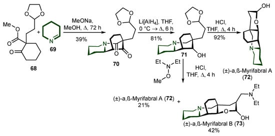 In [], acetal 69 and 2,3,4,5-tetrahydropyridine 69 were used as starting compounds for the preparation of alkaloids (±)-α,β-Myrifabral A (72) and B (73), the reaction of which resulted in lactam 70. Reducing lactam 70 with lithium aluminum hydride led to the formation of amino alcohol 71 in the form of a mixture of two diastereomers; however, via column chromatography, it was possible to isolate the main diastereomer with 81% yield. Treating alcohol 71 with hydrochloric acid promoted cyclization, leading to the formation of (±)-α,β-Myrifabral A (72) at 92% yield. It should be noted that synthesis is possible on a scale of several grams. Treating acetal 71 with hydrochloric acid and N,N-diethyl-O-methylhydroxylamine led to a mixture of (±)-α,β-Myrifabral A and B, which were successfully separated (Scheme 16). It should be noted that the Myrifabral alkaloids are a relatively new, small family of polycyclic alkaloids. These alkaloids were first isolated in 2002 from the plant of Myrioneuron nutans species [,], and are currently being actively studied.