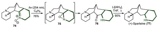 The work [] describes the enantioselective synthesis of the alkaloid (+)-Sparteine (77), based on the Beckmann photo-rearrangement (Scheme 17). Photolysis in benzene at 254 nm provided a smooth rearrangement of lactam 76 with a yield of 76%. Removal of the lactam carbonyl using lithium aluminum hydride led to (+)-Sparteine in a virtually quantitative yield. The key photochemical stage proceeds in mild conditions without any metal catalysts and provides entry to the rather complex scaffold. The operational simplicity and readily available reagents render photochemical transformations very promising for industrial applications. It should be noted that Sparteine is one of the few alkaloids that is currently used in medical practice as an antiarrhythmic agent and sodium channel blocker. In addition, Sparteine is widely used in asymmetric synthesis as a chiral ligand [,], which makes this alkaloid a very valuable product.