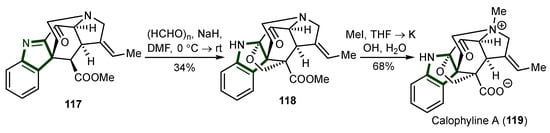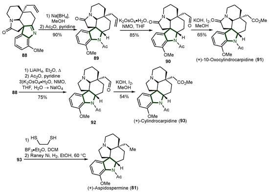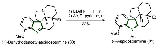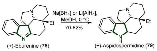 Aspidosperma alkaloids are a large family of naturally occurring and structurally related indole alkaloids with diverse biological activities [,]. Therefore, this important class of compounds has been the subject of review articles related to their synthesis [,,]. Aspidospermidine is the simplest representative of this class of alkaloids, from which more complex structural alkaloids are synthesized. Notably, plants were the first source of bioactive compounds due to their abundance, diversity and availability. Thus, the semi-synthetic drugs often have better availability. There are a number of advantages associated with semi-synthetic alkaloid-based drugs, including a short synthesis scheme, a high yield of optically pure product, increased bioavailability, improved solubility, decreased toxicity, and increased selectivity [,]. Aspidospermidine (79) was synthesized quite easily from another alkaloid, Eburenine (78), by reduction with sodium borohydride or lithium aluminum hydride [,,,,,,,] (Scheme 18). The alkaloid Eburenine (78) is a major component of Rhazya stricta [,].