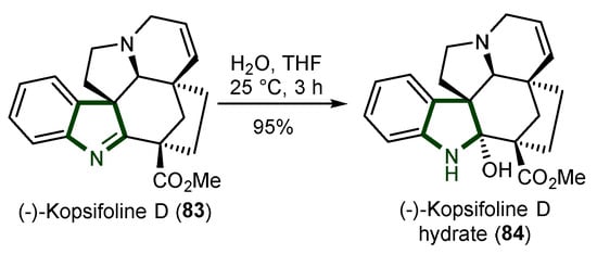 Addition of water to (-)-Kopsifoline D (83) yielded (-)-Kopsifoline D hydrate (84) (Scheme 21). It should be noted that a synthesis method consisting of simply stirring the imine 83 in a tetrahydrofuran–water mixture allowed the product to be isolated at 95% yield [].