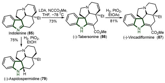 In a series of papers [,,,], enantioselective synthesis of the alkaloids (−)-Tabersonine (86), (−)-Vincadifformine (87), and (−)-Aspidospermidine (79) (Scheme 22) is described. Indolenine (85) serves as a key intermediate product in the synthesis of Aspidosperma alkaloids. Complete hydrogenation of Indolenine (85) in the presence of Adams catalyst in ethanol at room temperature led to (−)-Aspidospermidine with a yield of 75%. From indolenine, it is also possible to synthesize (−)-Tabersonine and (−)-Vincadifformine, with product yields exceeding 70%. Here, we would like to mention the alkaloid (−)-Tabersonine, since it has a variety of biological activities: it suppresses the formation of amyloid fibrils [], attenuates kidney damage caused by obesity [], and exhibits antitumor [,] and anti-inflammatory [] activities.