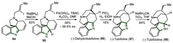 The reduction of an imine to an amine is described; this amine, in turn, underwent an intramolecular Heck reaction to form (-)-Dehydrotubifolin (96). (-)-Tubifolin (97) was synthesized by selective hydrogenation of the double bond in (-)-Dehydrotubifolin (96), and subsequent reduction of the imine group led to the formation of (-)-Tubifolidin (98) (Scheme 24) [,].
