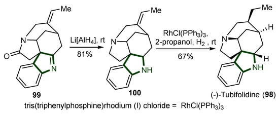 Reduction of compound 99 with lithium aluminum hydride in tetrahydrofuran resulted in the formation of amine 100. Amine 100 was finally converted to Tubifolidin (98) in the presence of tris(triphenylphosphine) rhodium (I) chloride in benzene and 2-propanol at room temperature at 67% yield (Scheme 25) [].