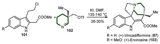 An asymmetric total synthesis of (+)-Vincadifformine (87) and (+)-Ervinceine (103) is described in [,]. Thus, indole 101 reacted with imine 102 in the presence of potassium iodide in DMF to form alkaloids (Scheme 26). Interestingly, the authors successfully isolated an enantiomerically pure compound without use of chiral catalysts. Moreover, the reaction was carried out at elevated temperature, which is not typical for asymmetric synthesis.