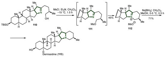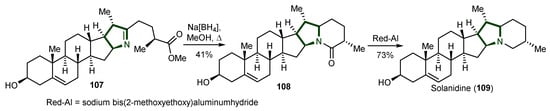 For the synthesis of Solanidine (109), polycycle 107 was used as a starting compound, which was sequentially reduced with sodium borohydride and Red-Al [] (Scheme 28). This alkaloid is interesting because it is a very important precursor for the synthesis of hormones and some pharmacologically active compounds, such as progesterone and cortisone []. Solanidine is a poisonous alkaloid that is found in fairly large quantities in plants of the Solanaceae family. This has made Solanidine a precursor for the further synthesis of useful compounds. Solanidine itself is a biomarker for various cytochrome CYP2D6 genes [,].
