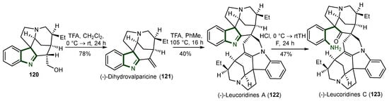 - Kokkonda, P.; Brown, K.R.; Seguin, T.J.; Wheeler, S.E.; Vaddypally, S.; Zdilla, M.J.; Andrade, R.B. Biomimetic Total Syntheses of (−)-Leucoridines A and C through the Dimerization of (−)-Dihydrovalparicine. Angew. Chem. 2015, 127, 12823–12826. [Google Scholar] [CrossRef]
