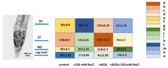 | +AEDL + 150 mM NaCl | 4.8 ± 0.24 b | 3.1 ± 0.15 c | 1.3 ± 0.06 c | 0.44 ± 0.02 b |