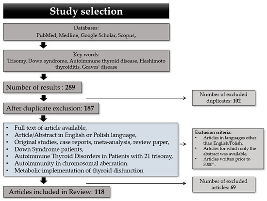 After title/abstract screening, the authors included original articles as described below. Other review papers, meta-analyses and case reports mentioned in this article were used solely to present a summary of the discussed matter. We included papers with information about the pathogenesis of autoimmunity in the thyroid gland and the clinical presentation of HT and GD, especially focused on patients with T21. All articles not meeting the inclusion criteria were excluded by both authors. We decided to exclude articles in languages other than English/Polish, articles for which only the abstract was available, articles published prior to 2000 and articles without information about the pathogenesis of HT and GD. The study selection process is shown in Figure 1.