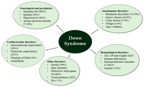 Diseases associated with trisomy 21. JIA—juvenile idiopathic arthritis; a—of all congenital heart defects; b—patients with DS aged > 65 years old; c—of children with DS; d—transient myeloproliferative disorder in patients with DS up to 3 months of age; e—in adults with DS; f—in comparison to non-DS [35,36,37,38,39,40,41,42,43,44,45,46].