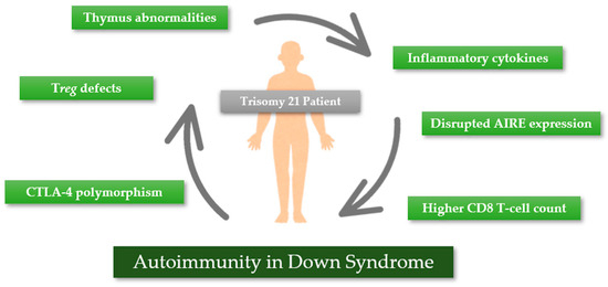 All the above-mentioned factors promote autoimmunity in the population with DS, as summarized in Figure 3.