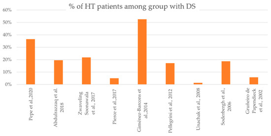 The results of investigations that aimed to present the increased prevalence of HT in patients with DS are presented in Table 1 and are graphically presented in Figure 4. Based on the mentioned studies, patients with DS are more susceptible to HT in comparison to healthy individuals.