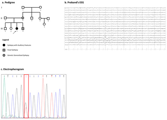 The proband is a 24-year-old right-handed female with a late childhood history of focal epilepsy. She experienced focal auditory-aware seizures ranging from simple elementary sounds (like noises, ringing, and humming) to complex auditory hallucinations. Sometimes these focal seizures impaired her awareness. She did not have febrile seizures, receptive aphasia, or intellectual disability. Neurological examination was unremarkable, a wakefulness EEG showed focal right temporal epileptiform discharges (Figure 1b), and brain magnetic resonance imaging (MRI) was unremarkable. The proband’s brother, with no history of learning disabilities and a normal psychomotor development, had focal epilepsy starting during childhood. Her mother, with no history of intellectual disability and normal psychomotor development, had a history of childhood absence epilepsy (CAE) syndrome, evolving during adulthood into a generalized epilepsy with sporadic tonic–clonic seizures.