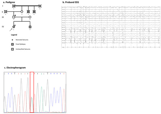 The proband is a 21-year-old right-handed female with normal psychomotor development as well as the normal acquisition of the milestones. She experienced tonic–clonic seizures during the first four days of life. At the age of 3 years, she started to manifest, at the same time, the following three different types of afebrile seizures: tonic focal seizures with right head deviation and impaired awareness, eyelid myoclonia, and focal to bilateral tonic–clonic seizures during sleep. The neurological examination was unremarkable, with an intellectual quotient (I.Q.) of 91, and the EEG revealed focal epileptiform discharges located in bilateral centro-parietal regions (Figure 2b). The MRI showed a slight bilateral enlargement of ventricular horns. She started phenobarbital during childhood, with excellent seizure control. Her brother reported a history of focal epilepsy with seizures starting during childhood, which were well controlled by a single monotherapy, and no history of intellectual disability. Her father had only a history of seizures during the first day of life without late-onset epilepsy. The two brothers of the paternal grandmother, deceased and not available for clinical evaluation, also had a history of unclassified epileptic seizures.