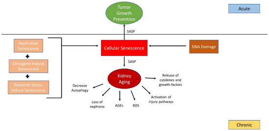 Aging has been recently recognized as a disease and also a significant contributor to increase acute kidney disease (AKD) and chronic kidney disease (CKD) [12]; kidney aging pathogenesis includes the activation of various injury pathways, a decrease in podocyte autophagy, the release of cytokines and growth factors, and an increase in reactive oxygen species (ROS) and advanced glycation end products (AGEs) [13]. Signaling pathways reviewed by Teh et al. provided insight into aging-related autophagy-mTOR in podocyte injury, which is highly associated with foot process effacement (podocyte injury), which causes proteinuria [14]. It is believed that delaying aging is much more effective than treating a particular age-related disease. Figure 1 shows that cellular senescence contributes to kidney aging through decreased autophagy, loss of nephrons, and activation of injury pathways via senescence-associated secretory phenotype (SASP), while DNA damage, together with stress-induced senescence, oncogene-induced senescence and replicative senescence further drive chronic and acute pathological processes.