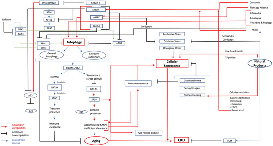 Cellular senescence (CS) is a fundamental feature that manifests and aggravates the condition of aging [13]. CS is an irreversible cell cycle arrest in which the cell still has metabolic activity, but no capability of replication [15]. There are three broad ranges of CS that were defined based on induction: replicative senescence (telomerase attrition), oncogene-induced senescence (activation of oncogenes), and oxidative stress-induced senescence [16]. A series of proteins secreted by the senescent cells is known as the senescence-associated secretory phenotype (SASP), an essential characteristic of senescent cells. The SASP will trigger the adjacent cells to release various inflammatory factors such as cytokines, growth factors, chemokines, and extracellular matrix remodeling factors [15]. The key regulator of SASP is known as GATA4, a transcription factor regulated by autophagy, but once the cell experiences senescence-inducing stimuli, it will escape the regulation by autophagy and start to accumulate [17]. However, for the kidney, cellular senescence was described by Schmitt et al. as referring to the intrinsic cellular responses to cumulative, low-level damage that occurs over the course of an individual’s lifespan and which may not become apparent until a certain threshold is reached [12]. On the other hand, extracellular vesicles (EVs) play dual roles in cellular senescence with SASP in chronic kidney disease, and are currently receiving attention from researchers in focusing on its involvement in kidney repair and a therapeutic direction [18]. The details of the role of EVs was examined in [18]. Therefore, exploring the signaling pathways of CS, autophagy, and SASP in CKD can provide insights into novel therapeutic targets.